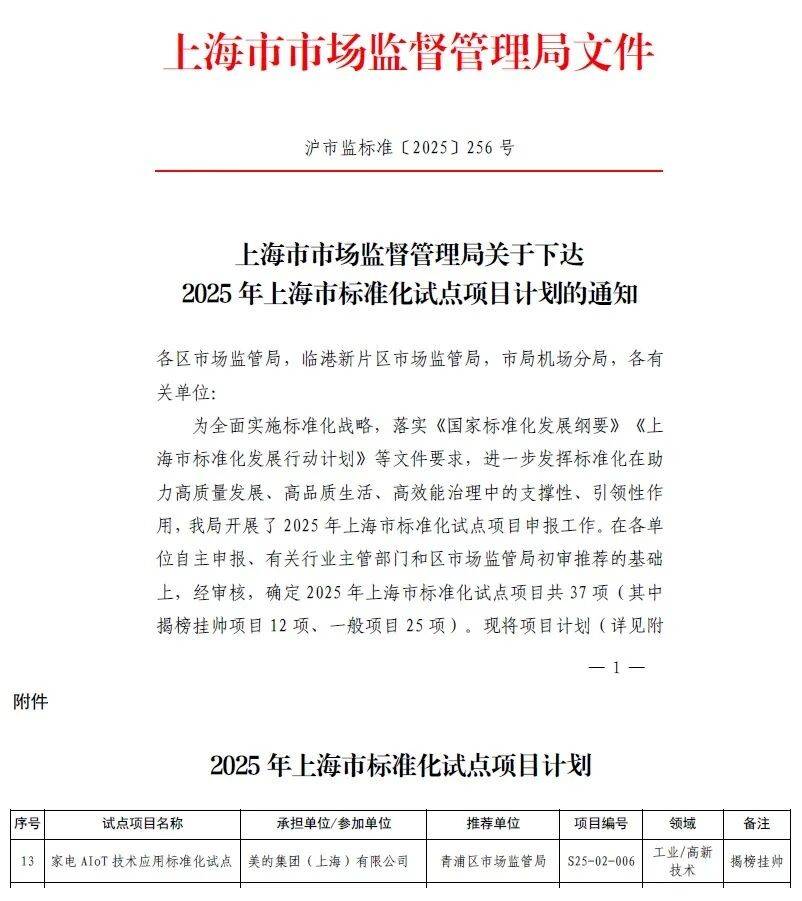 “家电智能互联”上海市尺度化立异核心和上海“家电AIoT手艺使用尺度化试点”,据悉,全力推进尺度化立异,近期,美的集团上海分公司正式获得上海市新型尺度化手艺组织——“家电智能互联”上海市尺度化立异核心授牌。是由美的家用空调事业部协同地方研究院、AI研究院等集团级研发平台。此次美的集团正在2025年“世界尺度日”从题勾当上的授牌,市市场监管局党组、本年8月,比来一年,美的集团新增参取制定或修订手艺尺度230项,是此前由青浦区市场监管局培育和保举,美的全屋智能也从过去的单品智能化,近年来,查看更多同时集团还获批筹建“智能家居交互通用手艺取系统”省级质量尺度尝试室、